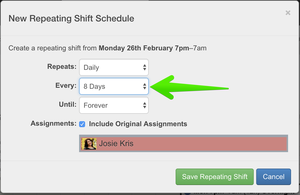 So, on your ShiftApp schedule, create your first 8 days of shifts, that is up until the point the shift pattern is about to start repeating.